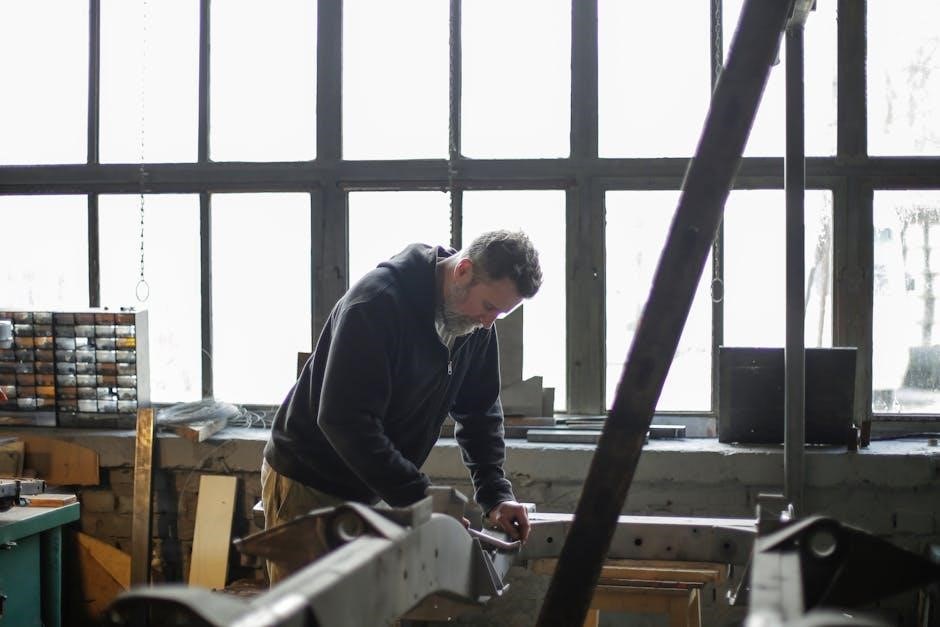 Replacing worn-out components is crucial for maintaining the functionality and safety of a manual garage door. Begin by identifying damaged parts through visual inspection or performance issues like noise or uneven movement. Common replacements include rollers, hinges, cables, and springs. Always refer to the garage door parts diagram for accurate identification; When replacing, ensure compatibility with your specific door model. For springs, consider professional assistance due to high tension risks. For other parts, use appropriate tools like wrenches or cable cutters. After replacement, lubricate moving parts to ensure smooth operation. Regular replacement prevents further damage and enhances door performance. Always follow safety guidelines to avoid accidents.